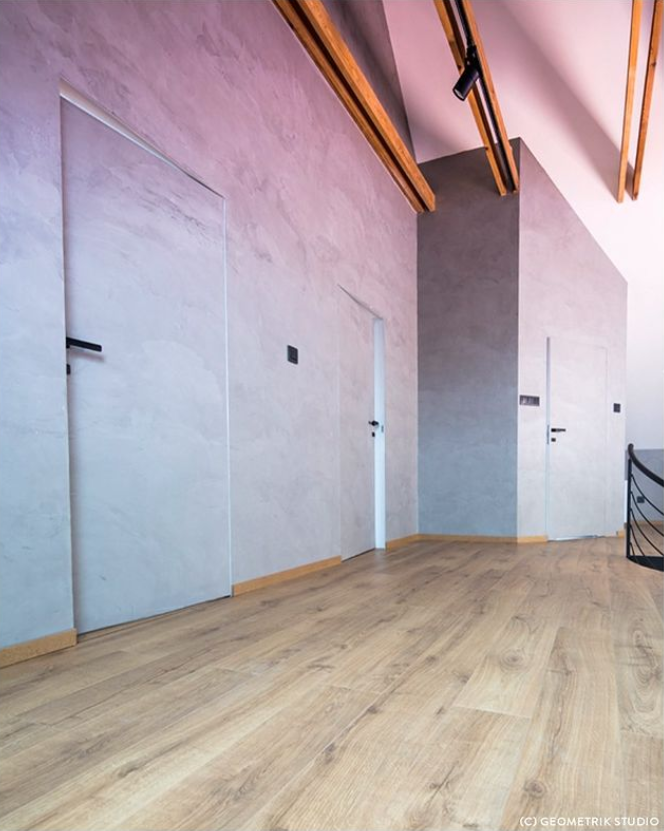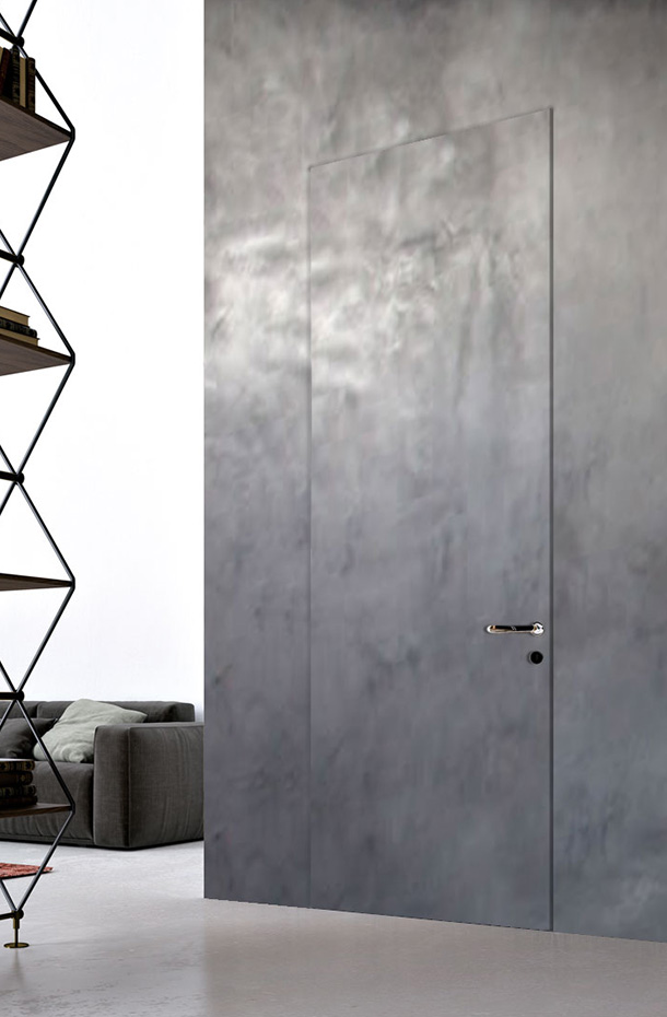 Gotowe drzwi włoskiej firmy Linvisibile pokryte jasno-szarym mikrocementem.