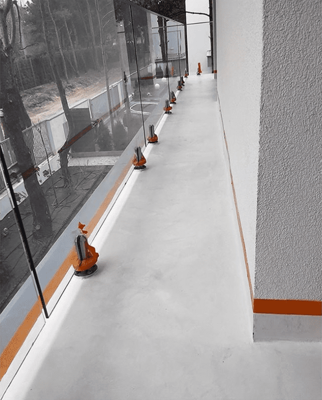 Przede wszystkim należy dobrze przygotować podłoże pod mikrocement. Podłoże musi być stabilne, pozbawione ruchomych elementów oraz suche. W każdym przypadku zalecamy wzmocnić podłoże używając mostka sczepnego z siatką z włókna szklanego. W przypadku tarasu nad garażem czy na ziemi, ważne będzie zastosowanie systemowej hydroizolacji na zewnątrz. Dlaczego? Jeśli podłoże będzie podciągać wodę z gruntu, mikrocement może się odspoić lub – jeśli woda zamarznie – wybrzuszyć się i popękać.