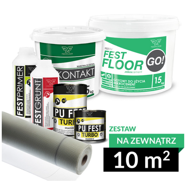 Nasz zestaw mikrocementu na zewnątrz zawiera wszystkie niezbędne produkty: mostek sczepny, siatkę, grunt, mikrocement, podkład pod lakier oraz lakier.