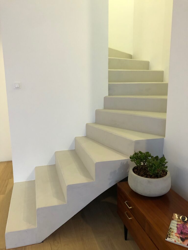 Wszystkie pokazane powyżej typy schodów, można wykończyć mikrocementem. Również otoczenie samych schodów takie jak ściany i posadzki można wykończyć tym materiałem. Możemy bawić się kolorami i zamiast tradycyjnej szarości wybrać np. schody z białego mikrocementu.